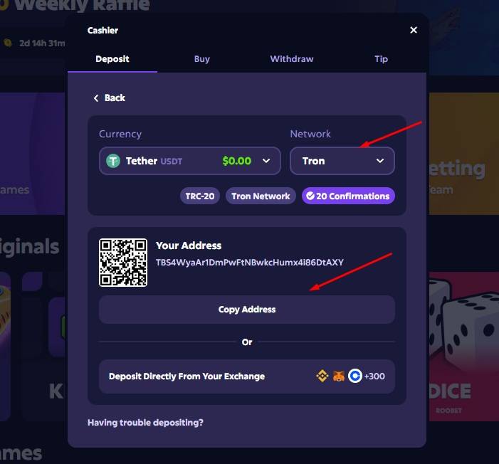 From there, choose your payment method (we’re going with USDT crypto coin). To show you how it’s done, simply choose the network you want (TRC-20 is the best option), and then copy the wallet address.