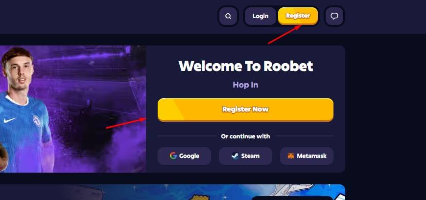 Go to Roobet.com and hit Register in the top-right corner. Make sure you’re on the official domain since Roobet has plenty of clones pretending to be the real site.